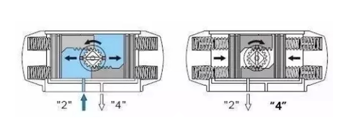 Kun ilmalähteen paine tulee ilma-aukosta (2) sylinterin kahden männän väliseen onteloon, kaksi mäntää erotetaan toisistaan ja siirretään sylinterin päitä kohti, ja molemmissa päissä olevien ilmakammioiden ilma poistuu ilma-aukon (4) kautta, ja kaksi männän telinettä synkronoidaan samaan aikaan akselin pyörittämiseksi (vastapäivään). Päinvastoin, kun ilmanlähteen paine tulee ilma-aukosta (4) sylinterin molemmissa päissä oleviin ilmakammioihin, kaksi mäntää liikkuvat sylinterin keskiosaa kohti. Keskimmäisessä ilmakammiossa oleva ilma poistuu ilma-aukon (2) kautta, ja kaksi mäntätelinettä käyttävät samanaikaisesti ulostuloakselia (vaihteistoa). ) Kierrä myötäpäivään. (Jos mäntä asennetaan vastakkaiseen suuntaan, ulostuloakseli pyörii vastakkaiseen suuntaan)