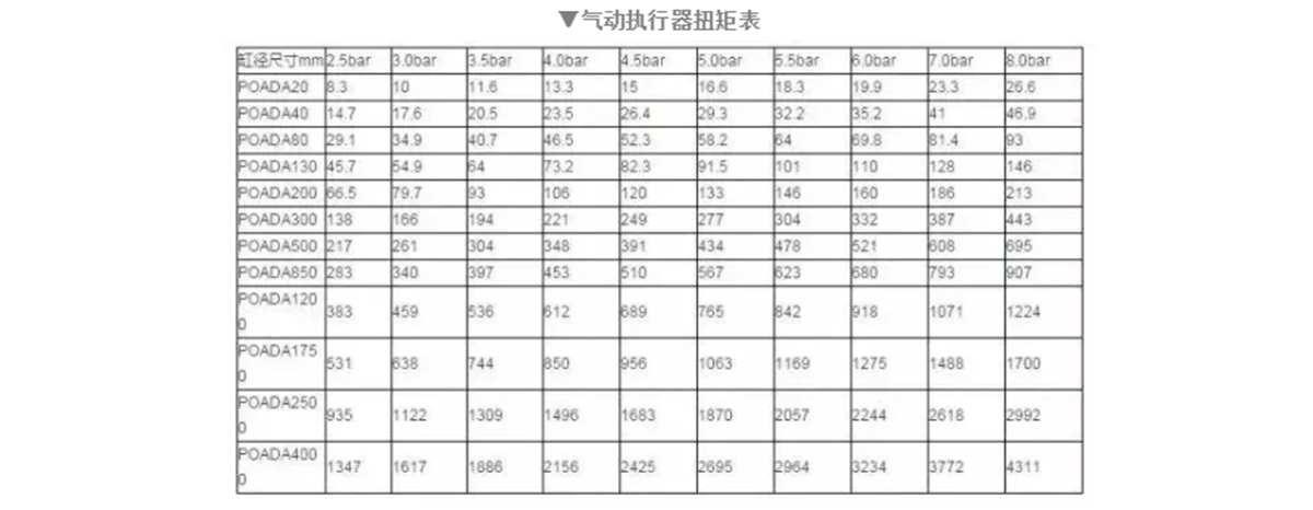 Kun venttiilin vääntömomentti on 210 NM, ilmalähteen paine on vain 5 bar ja väliaine on voitelematon vesihöyry, turvatekijät huomioiden nosta turvaarvoa 25 %, mikä on 262 NM. Etsi vastaava vääntömomentti, kun ilmalähteen paine on 5 bar kaksitoimisen lähtövääntömomenttitaulukon mukaan. arvo. Pitäisi valita 277NM, malli on POADA300.